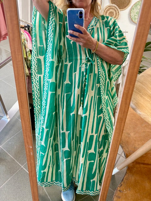 Dit lange kleed in katoen is je perfecte metgezel bij warm weer. Met een flatterende strop in de taille en verkrijgbaar in vier frisse prints, draag je het moeiteloos naar een feestje of over je badpak aan het zwembad. Comfort en elegantie in één.
